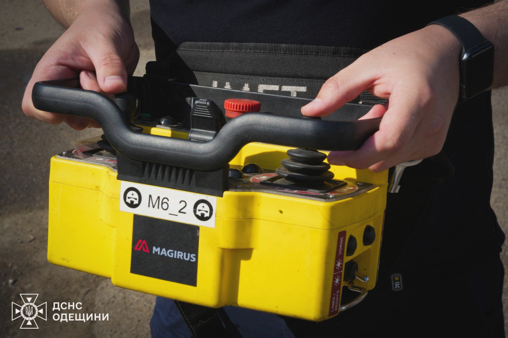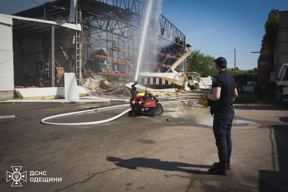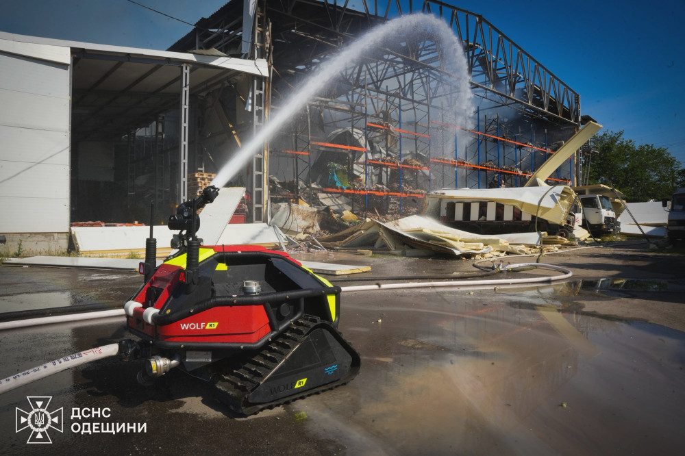 Пожарный робот Magirus Wolf R1, который используется одесскими спасателями, сегодня был привлечен для тушения пожара, вызванного российской атакой на город.