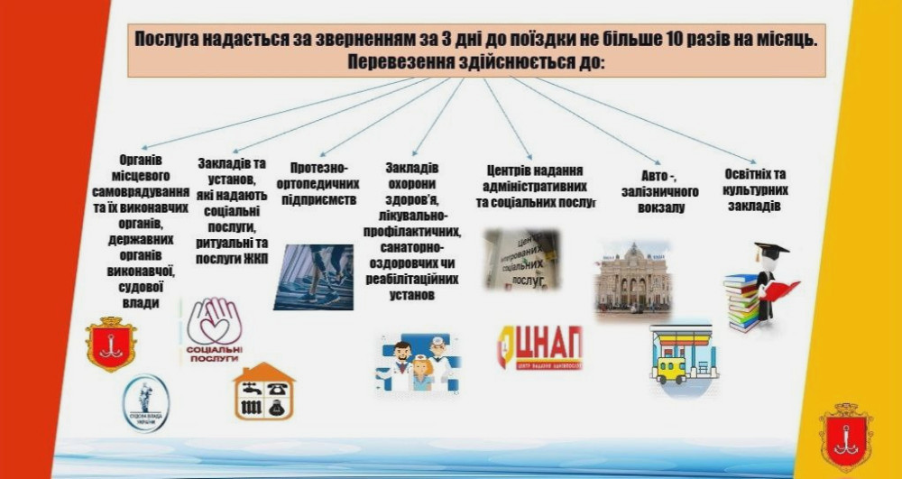 С целью создания благоприятных условий для безбарьерного передвижения людей с нарушениями опорно-двигательного аппарата, а также для лиц с инвалидностью по зрению I и II группы и детей с инвалидностью, согласно решению Исполнительного комитета Одесского городского совета, в городе введена новая социальная услуга 'Социальное такси'.