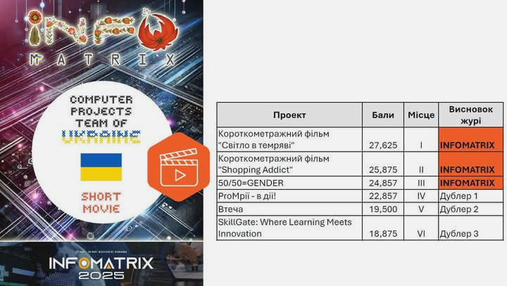 По итогам работы жюри суперфинала право представлять Украину на мировом финале международного конкурса компьютерных проектов INFOMATRIX-2025 получили: