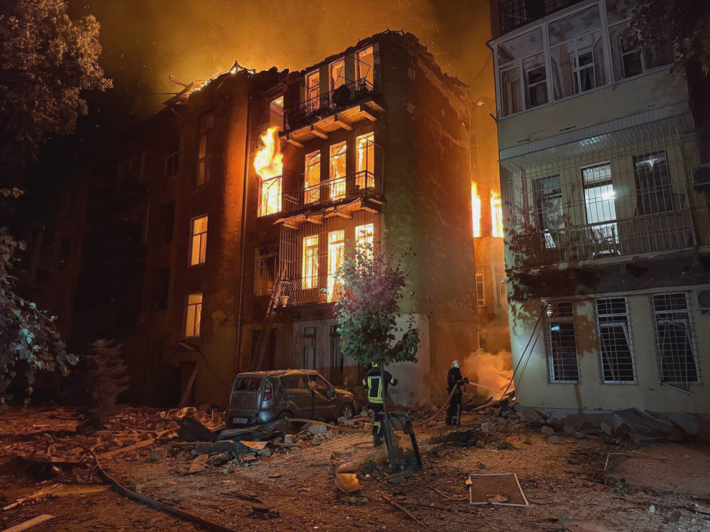 В результате удара беспилотника вспыхнул масштабный пожар, который уничтожил четырехэтажный жилой дом. Спасатели эвакуировали троих человек, еще шестерых вывели на безопасное расстояние.