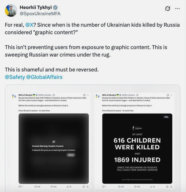 «Серьезно, X? С каких пор гибель украинских детей считается «неприемлемым контентом”? Это не защита пользователей, а сокрытие военных преступлений. Это неприемлемо, и это решение должно быть отменено», - отметил он в своем посте.