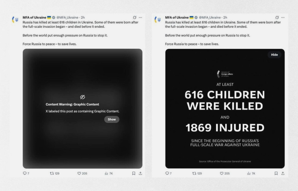 На изображении видно, что платформа X скрыла пост со статистикой о как минимум 616 погибших украинских детей и 1869 раненых с начала полномасштабного вторжения.