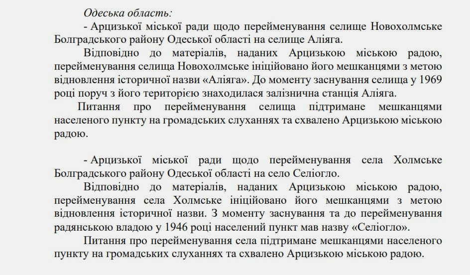 5 травня в парламенті України був зареєстрований проект постанови, який передбачає зміну назв дев'ятинадцяти населених пунктів, зокрема, двох у Одеській області.