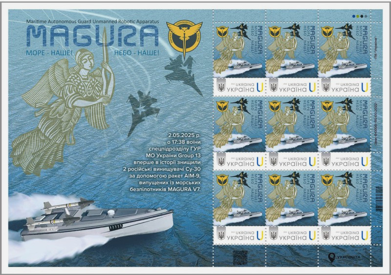 Укрпошта презентувала нову марку під назвою "MAGURA. Небо наше. Море наше", присвячену збиттю двох ворожих винищувачів Су-30 завдяки українським морським безпілотникам.