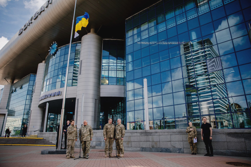 В перші дні повномасштабного вторгнення вагони Укрзалізниці стали свідками сліз і надії. Вони слугували тимчасовим притулком для тисяч українців. Тому символічно, що прапор піднімається саме над залізничними вокзалами.