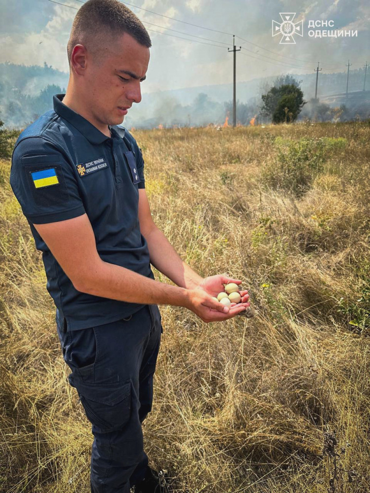 Птахи, рятуючись від вогню, не змогли забрати свої яйця. Рятувальник обережно переніс гнізда в безпечне місце, щоб дати шанс цим маленьким пташенятам на виживання.
