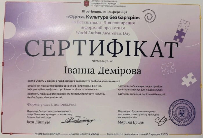2025 рік в Україні оголошено роком БЕЗБАР’ЄРНОГО ПРОСТОРУ, і конференція «Культура без бар’єрів» стала важливим етапом у реалізації цієї ініціативи в Одеському регіоні. Метою заходу було створення безбар’єрного простору в культурі, впровадження інклюзивних рішень та обмін досвідом з роботи з дітьми з особливими освітніми потребами (ООП), зокрема з розладами аутистичного спектру.