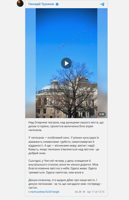 Сьогодні, в день Чистого четверга, коли триває очищення душі, пелікани пролетіли над містом. Вони є символом надії та нових початків.